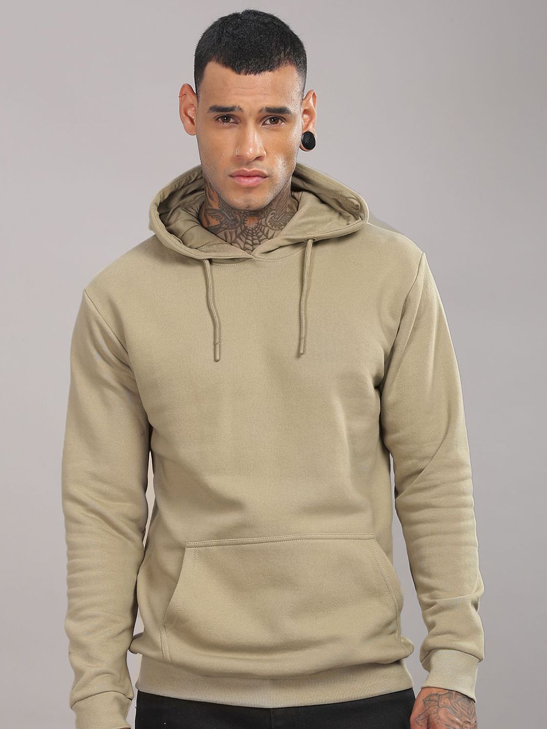 Men Beige Self Design Detail Hooded Pullover Sweatshirt