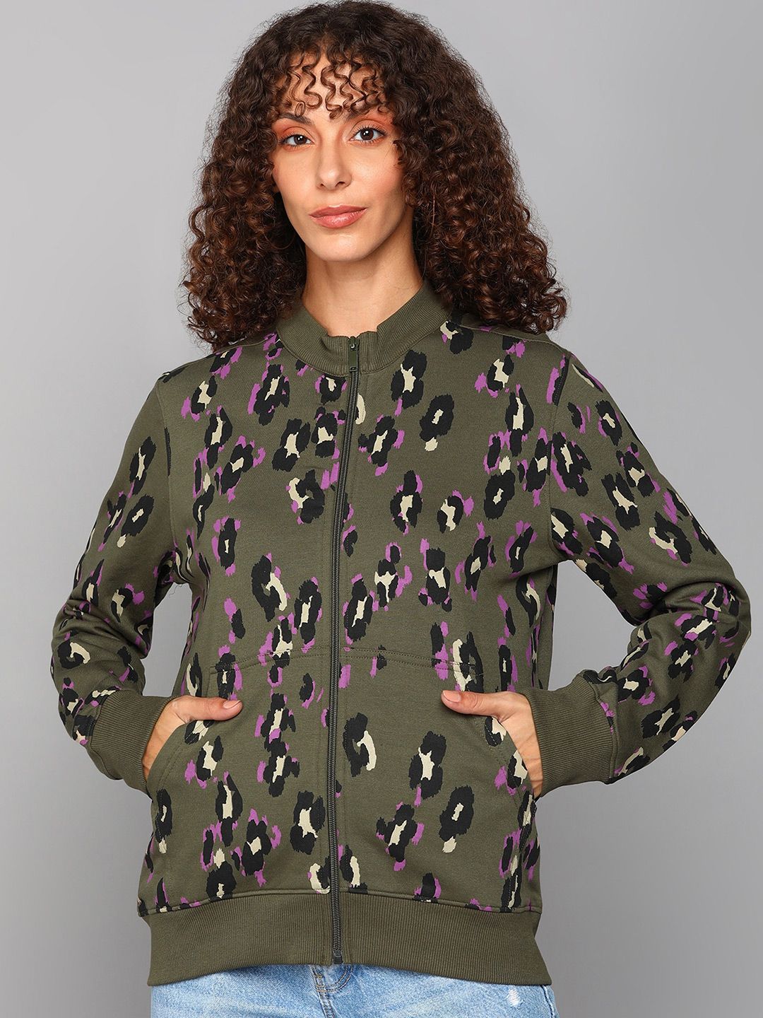 Women Black & Olive Green Animal Printed Acrylic Pullover