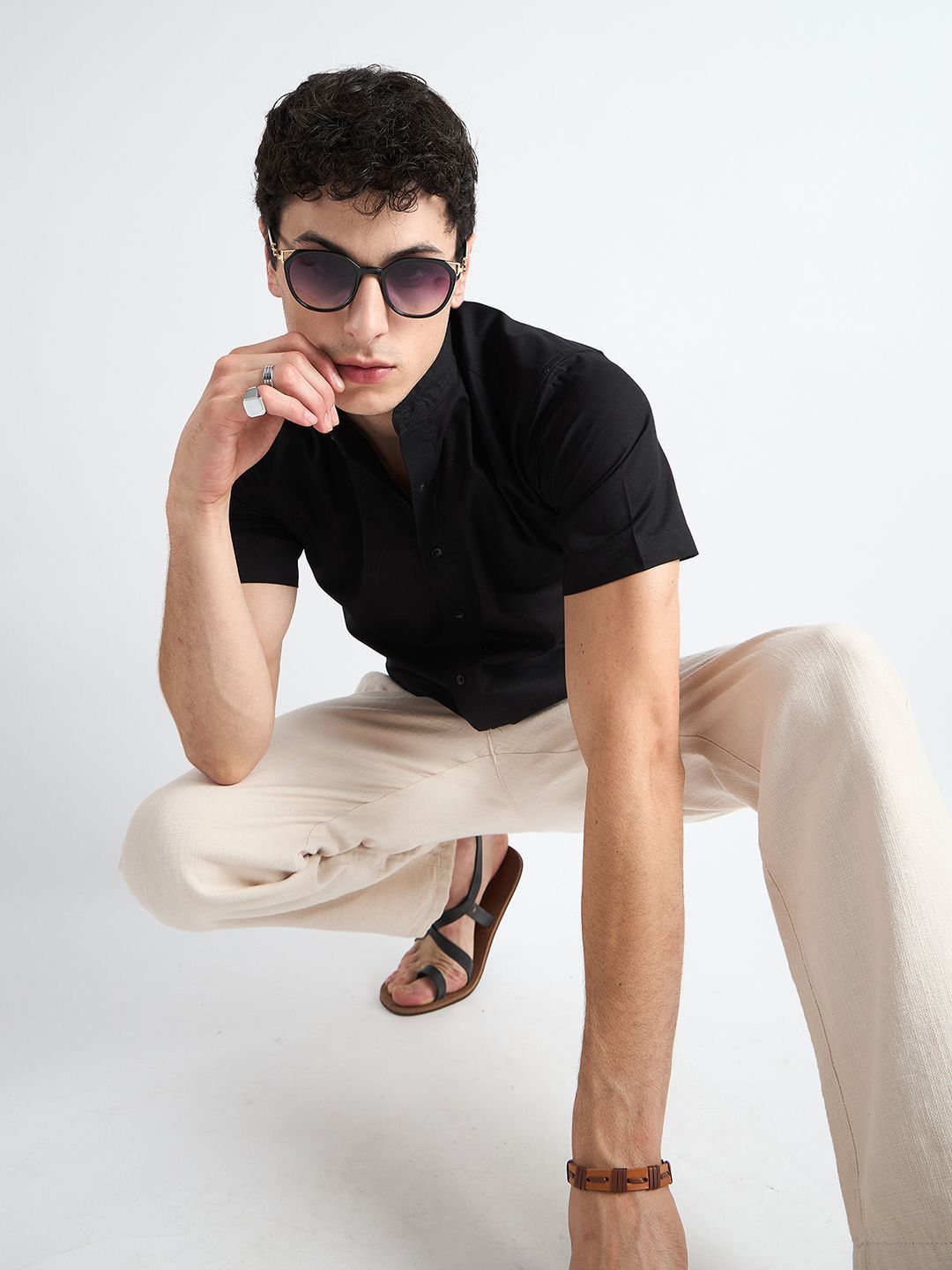 Black Classic Self Design Sciffli Spread Collar Casual Shirt