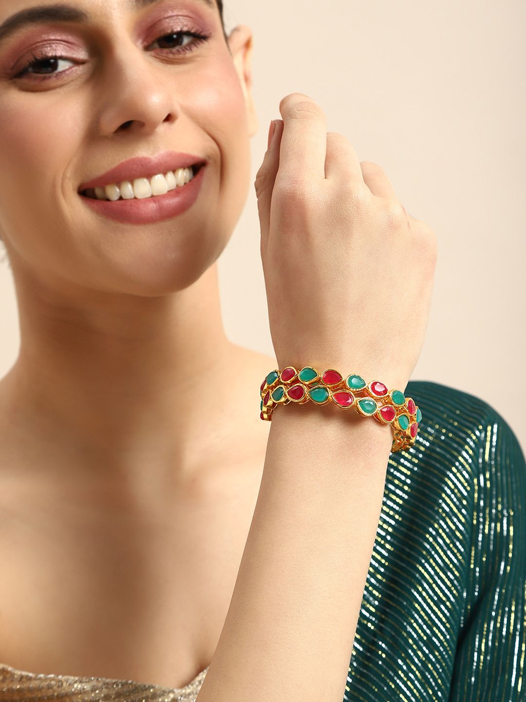 Green & Red Gold Plated Ruby and Emerald Studded Kada Bracelet