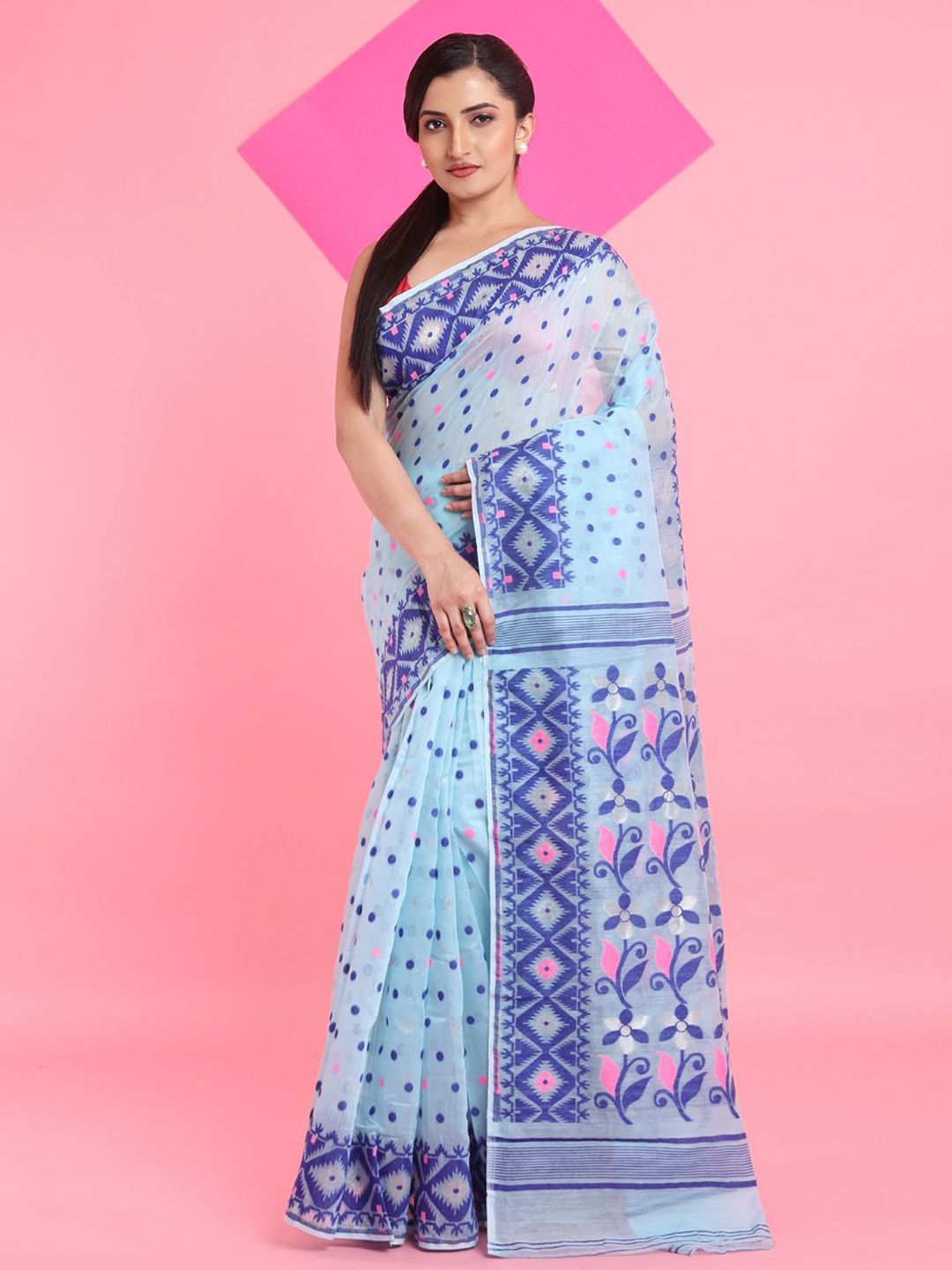 Blue & Silver-Toned Woven Design Zari Silk Cotton Jamdani Saree