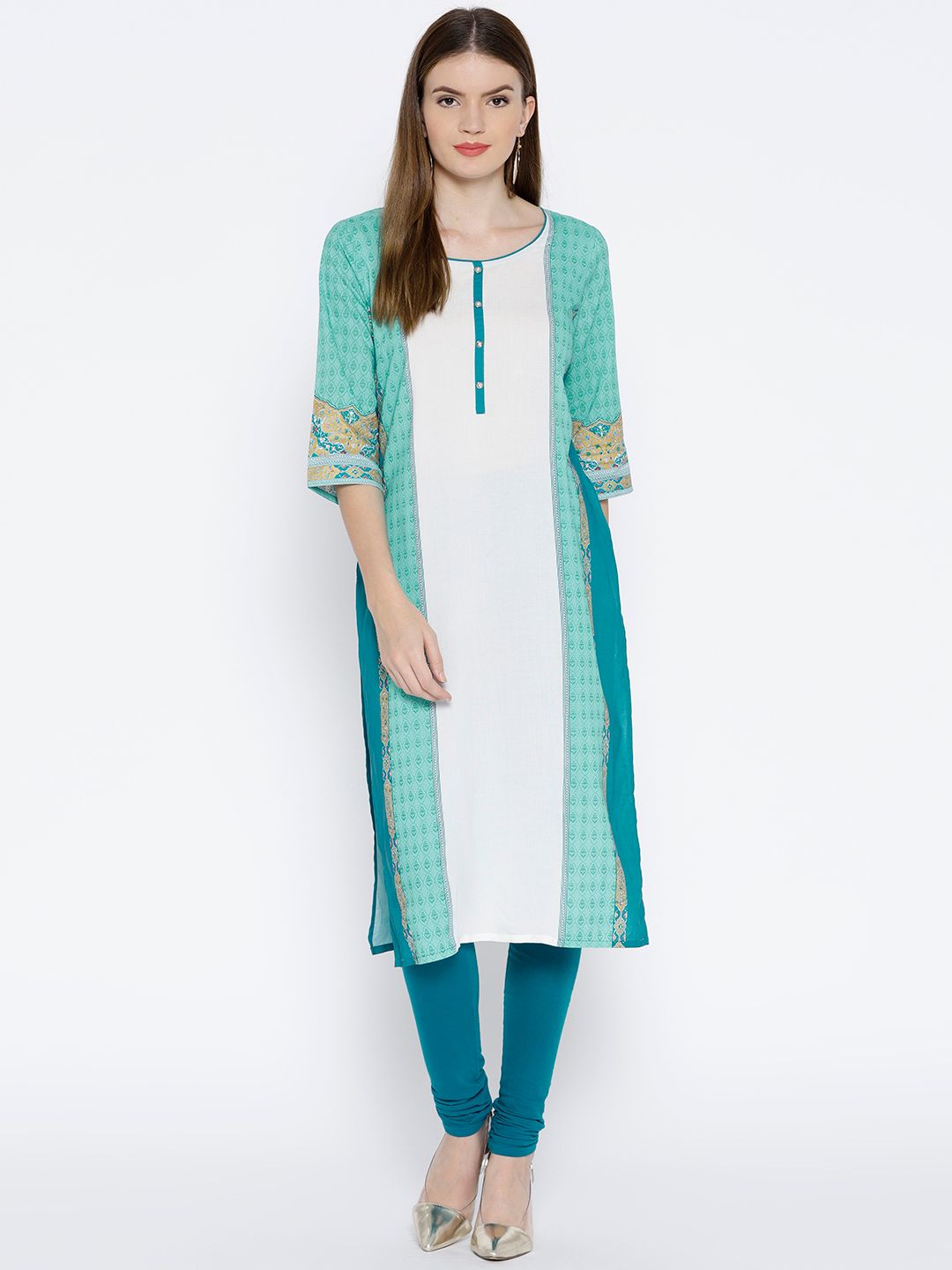 Women Sea Green & White Printed Straight Kurta