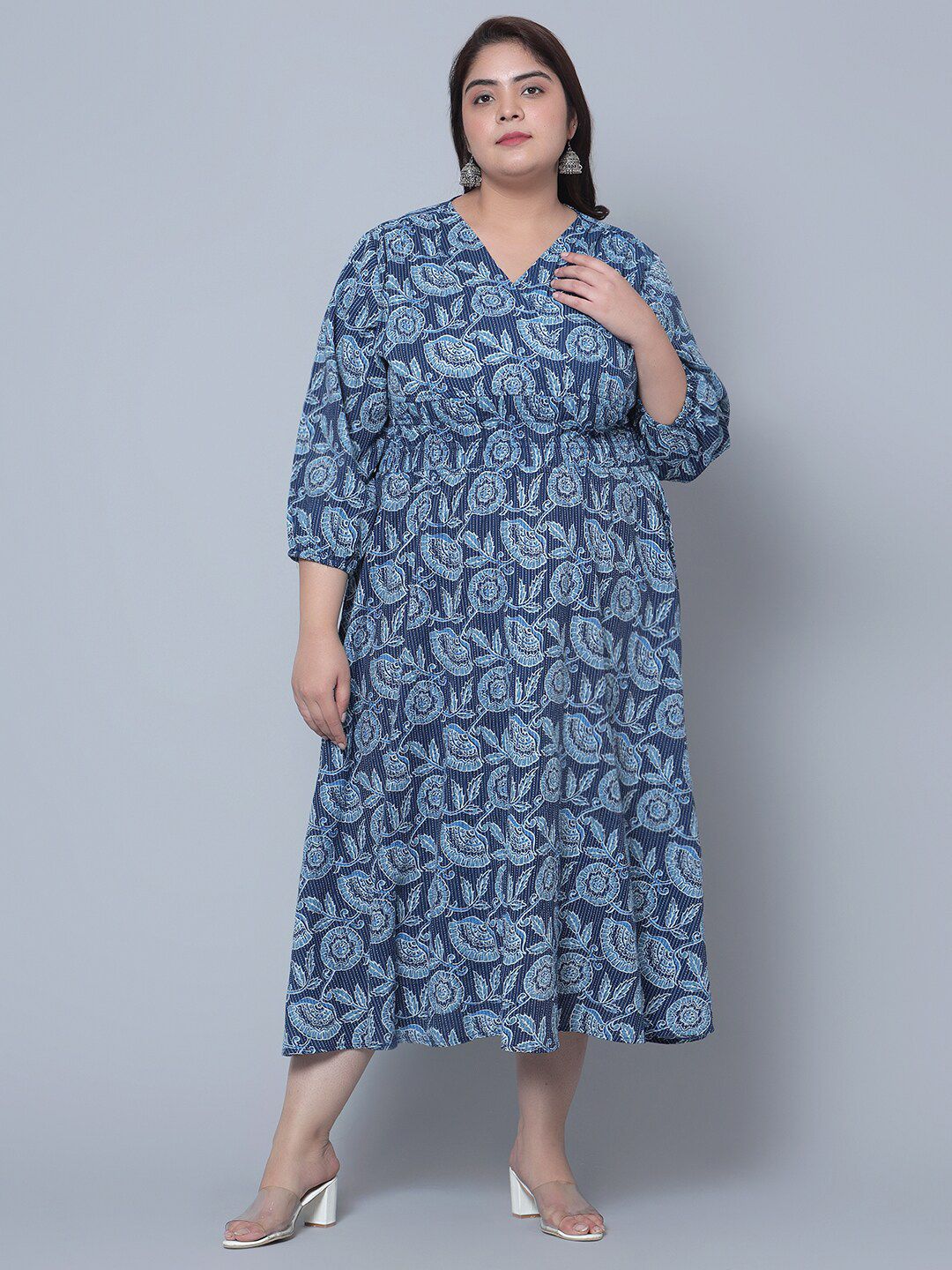 Women Blue Floral Printed Cotton A-Line Midi Dress
