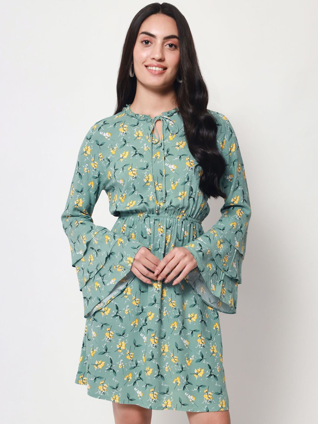 Floral Print Georgette Round Neck Bell Sleeve Fit & Flare Casual Dress