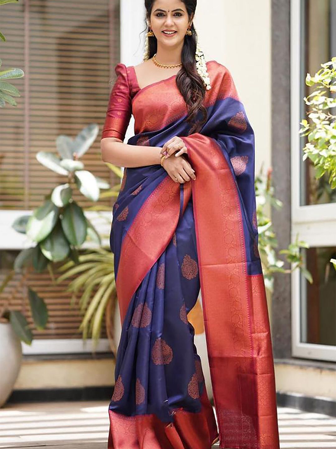 Navy Blue & Red Ethnic Woven Design Zari Saree