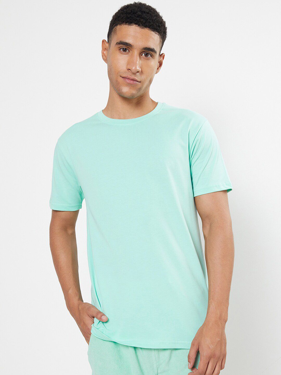 Men Aqua Blue Solid Round Neck Cotton T-shirt
