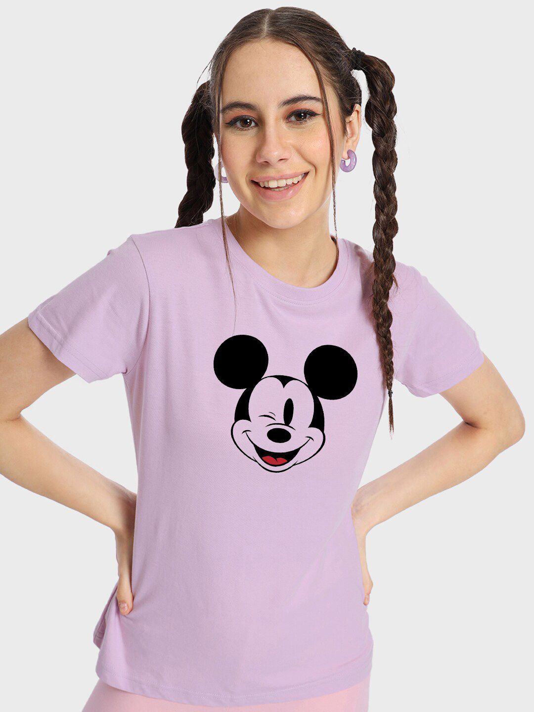 Women Pink Mickey Mouse Printed Cotton T-shirt