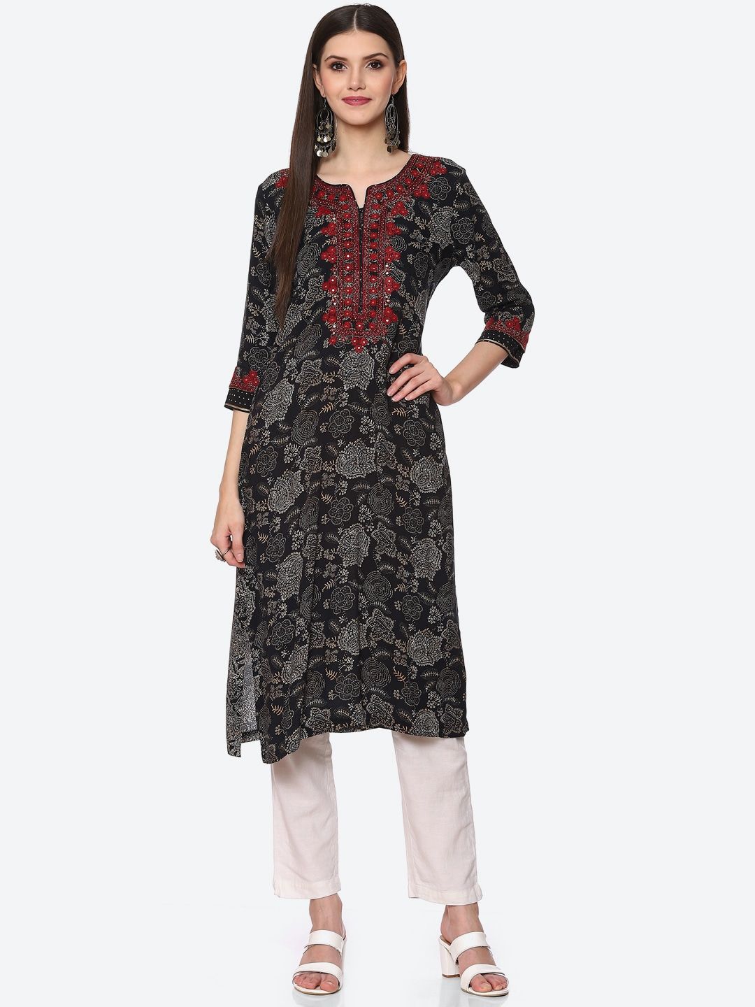Women Black Ethnic Motifs Printed Straight Fit Kurta