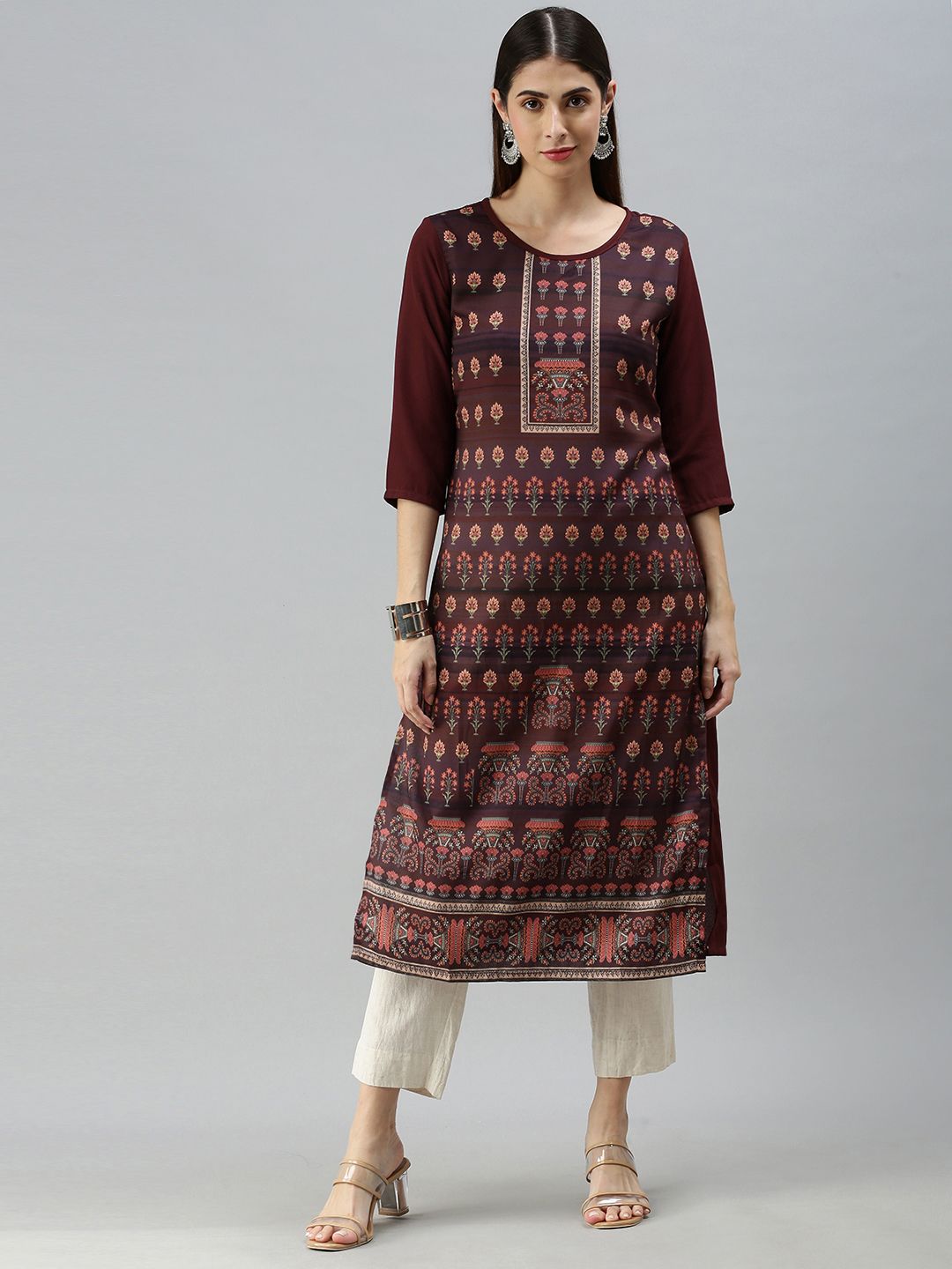 Women Women Maroon Ethnic Printed Straight Kurta With Three Quarter Sleeves