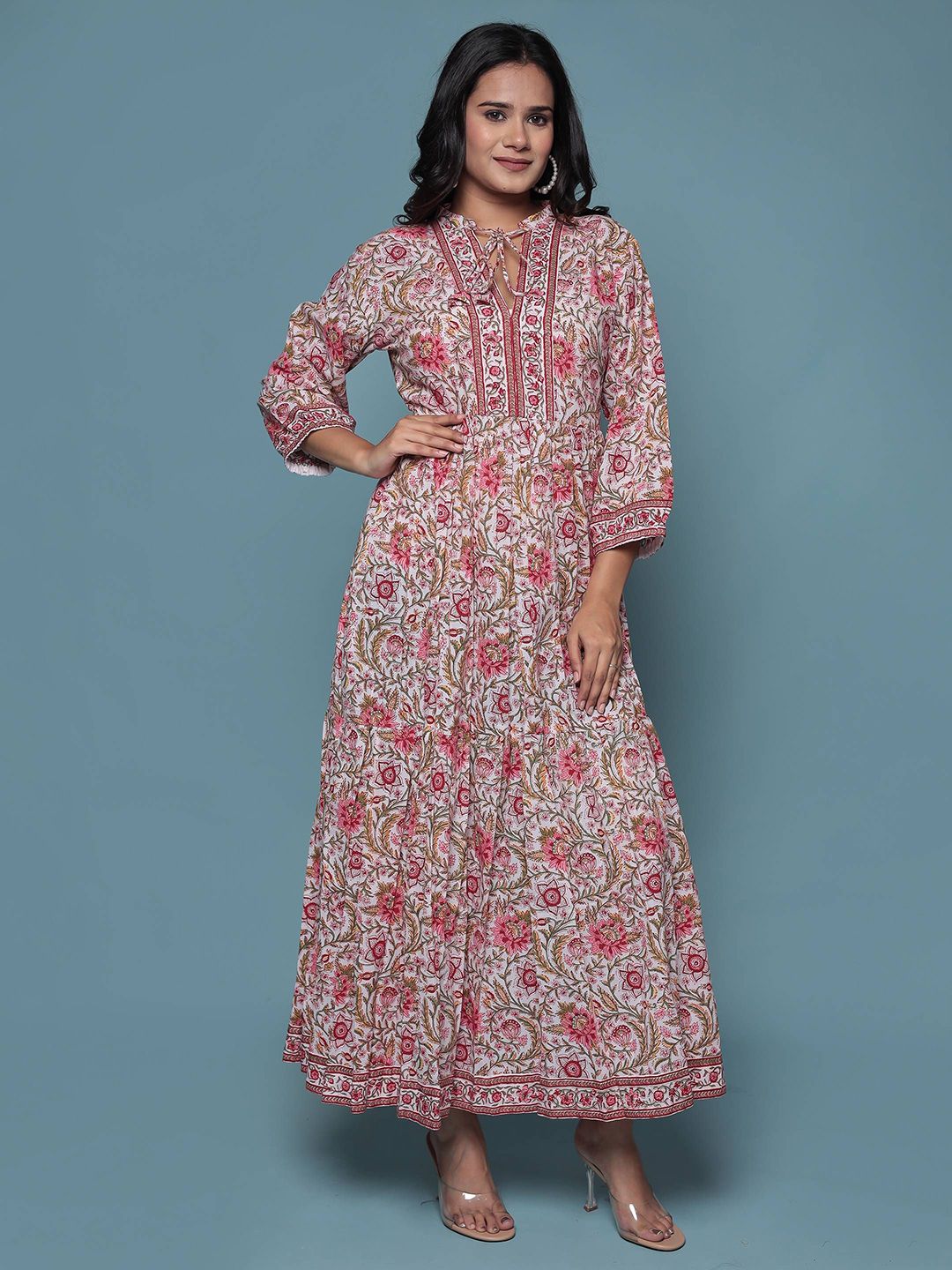 Floral Printed Round Neck Tiered Fit & Flare Midi Ethnic Dress