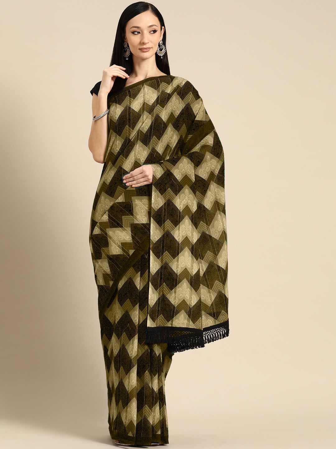 Olive Green & Khaki Pure Cotton Printed Bagru Saree