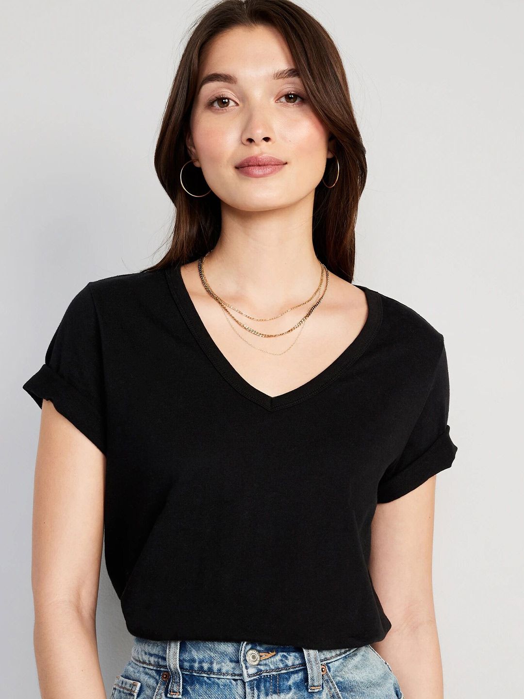 Women Black Solid V-Neck Pure Cotton T-shirt