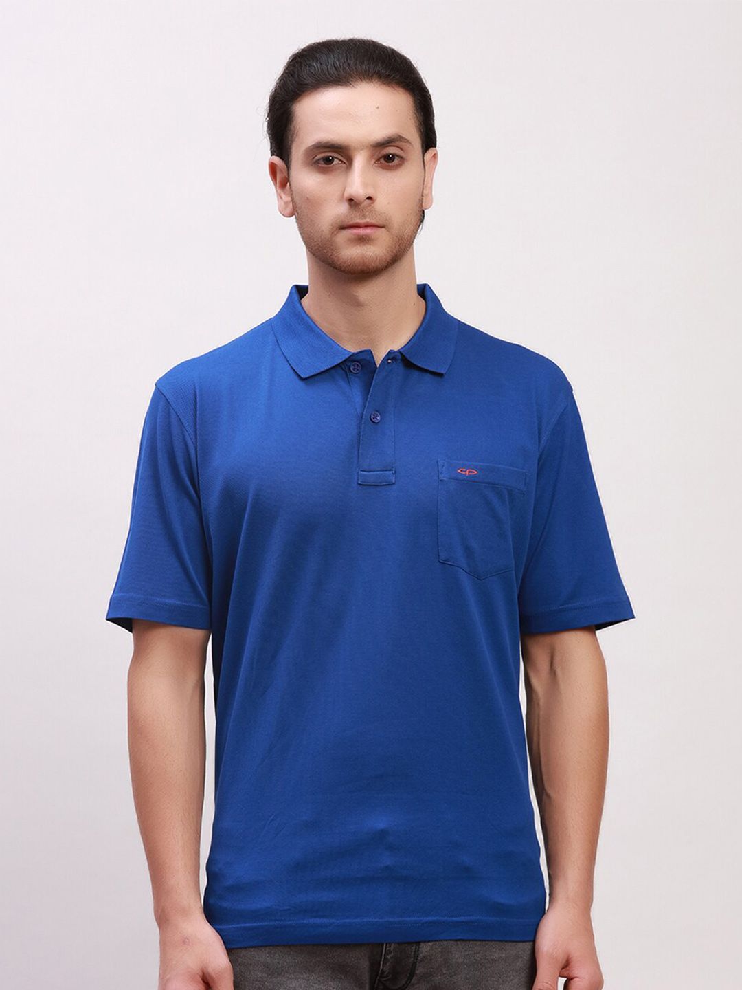 Men Blue Solid Polo Collar Pure Cotton T-shirt