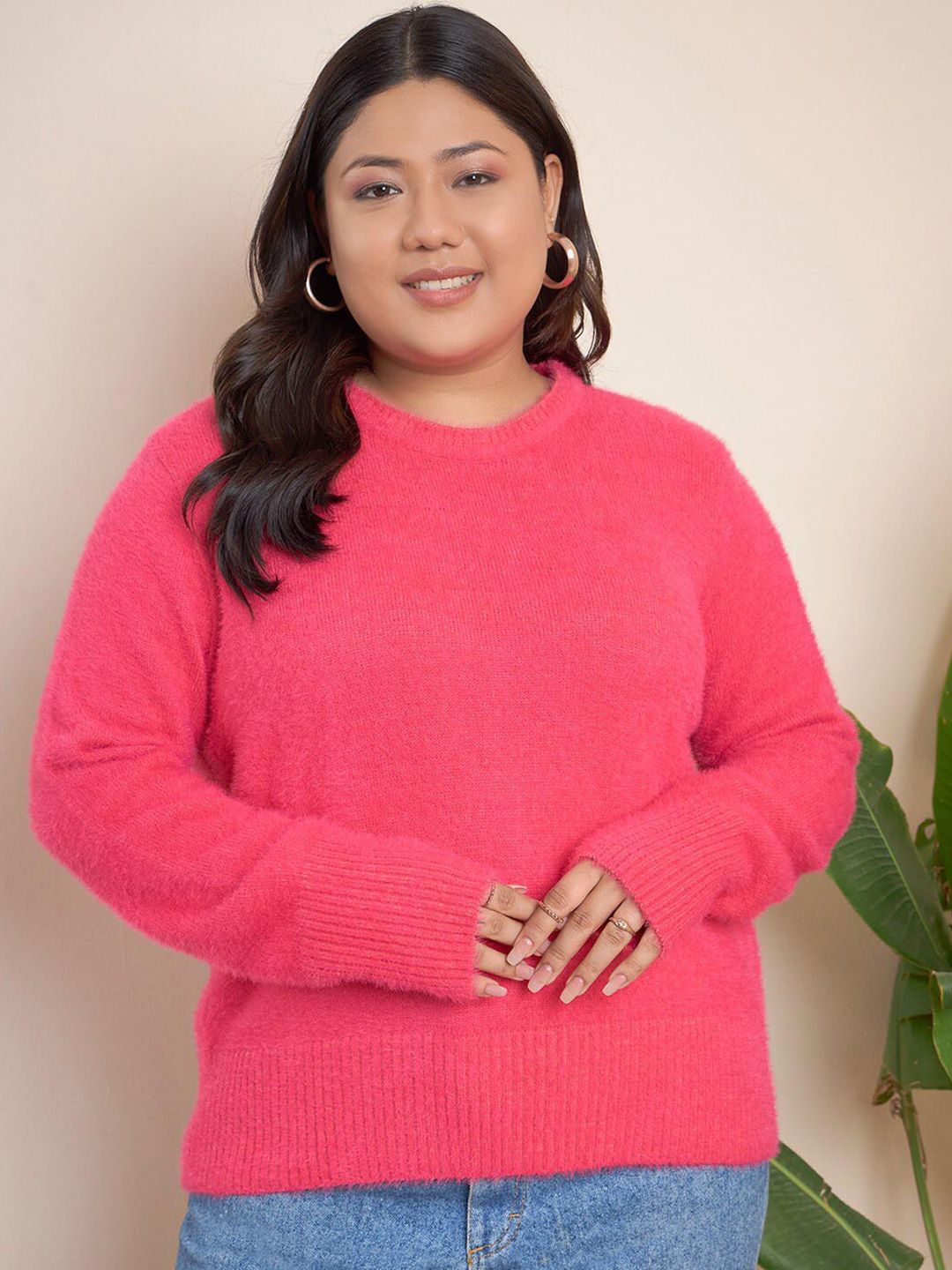 Plus Size Women Pink Cable Knit Acrylic Pullover