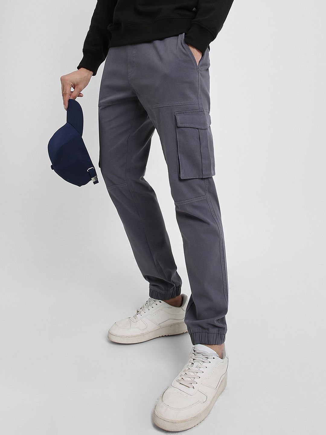 Men Grey Tapered Fit Cotton Cargo Joggers