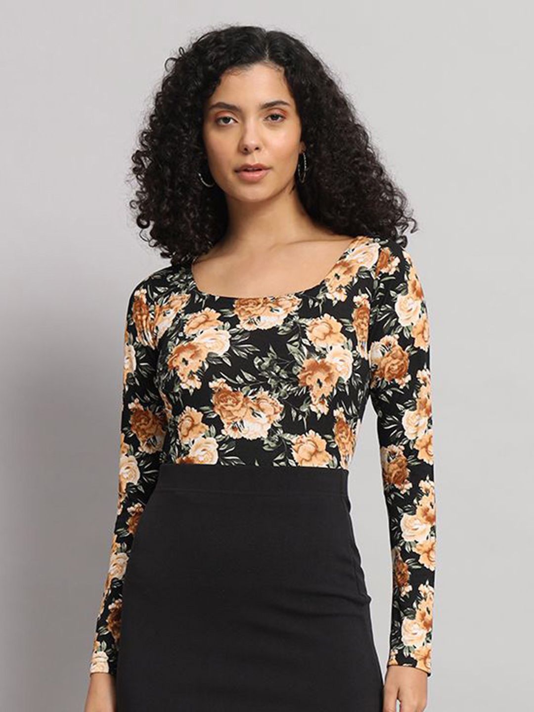 Women Black & Yellow Ditsy Floral Print Styled Back Top