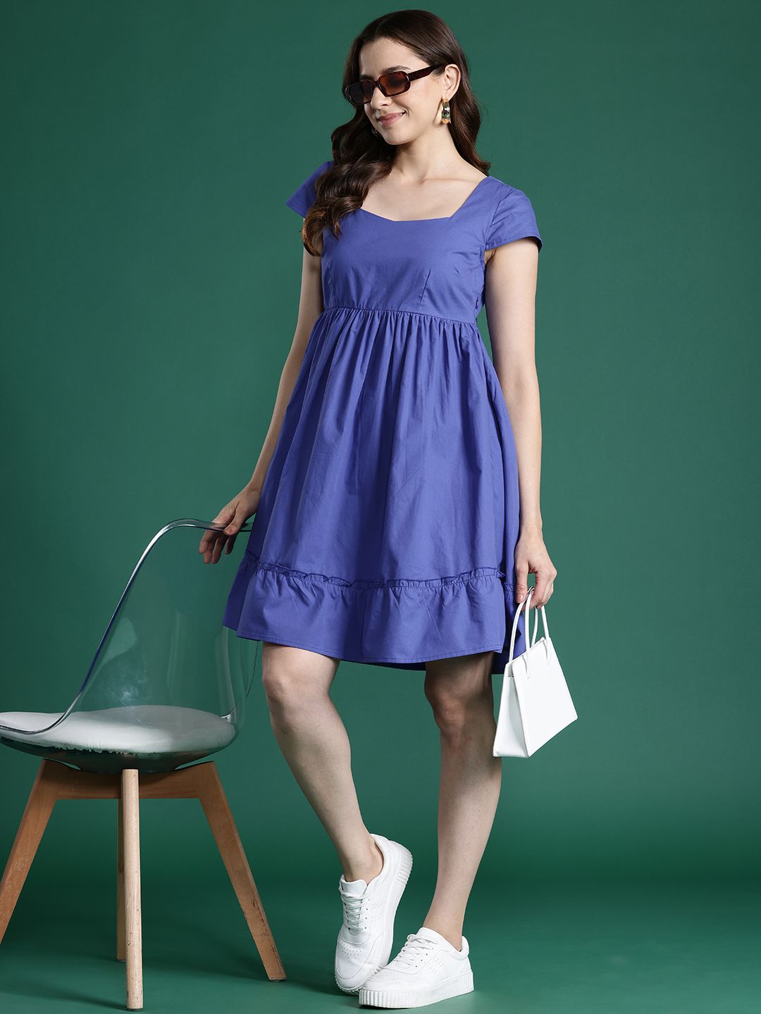 Navy Blue Solid Puff Sleeves Tiered Flared Dress