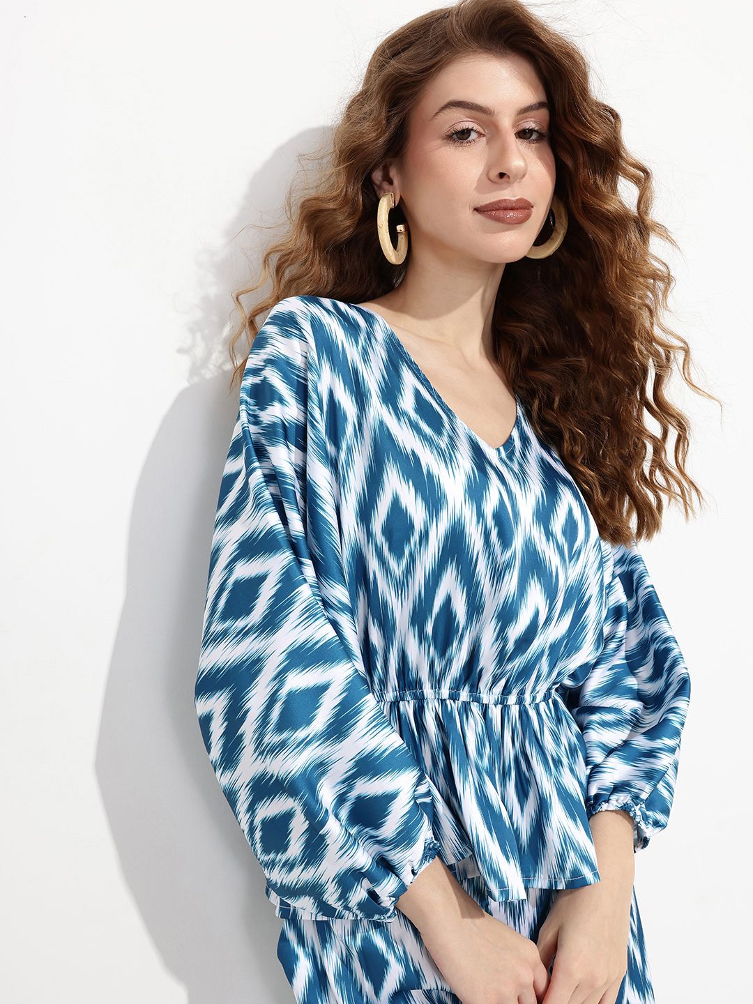 Geometric Print Bell Sleeve Pure Cotton Peplum Top