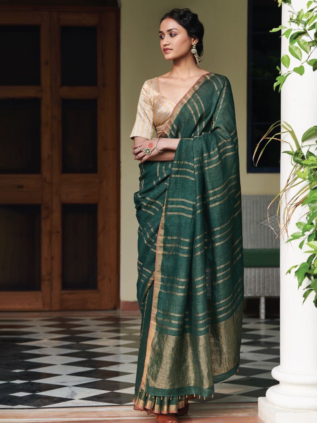 Green & Gold-Toned Ethnic Motifs Woven-Design Zari Banarasi Silk Saree