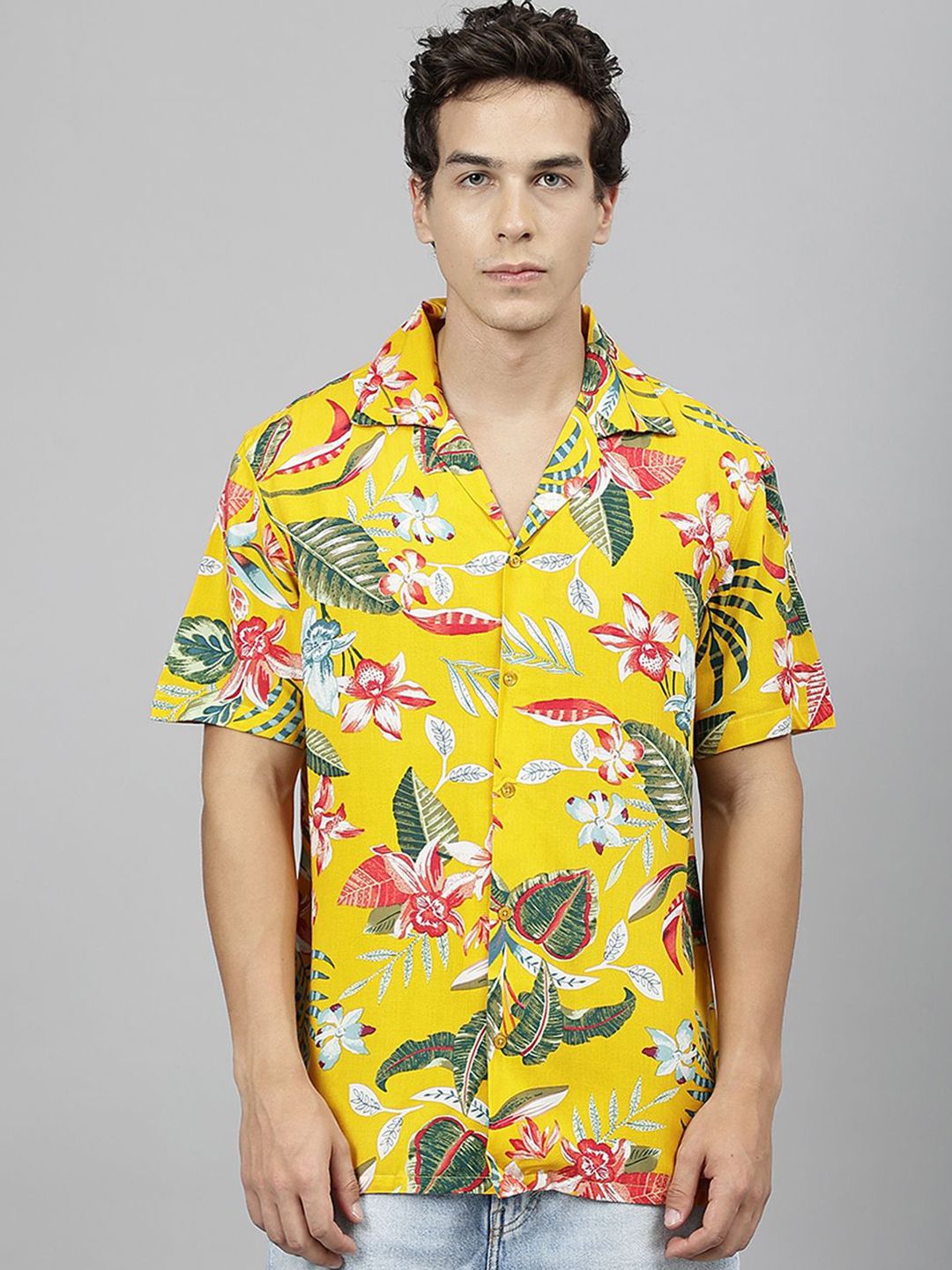 Men Mustard Yellow Floral Printed Casual Linen Shirt