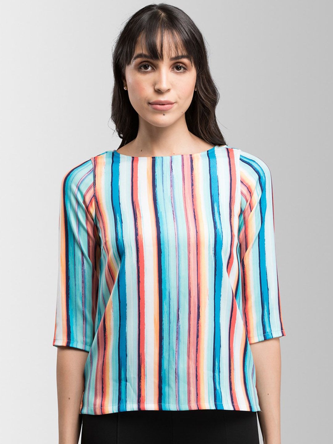 Women Multicoloured Striped Mandarin Collar Pure Cotton Top