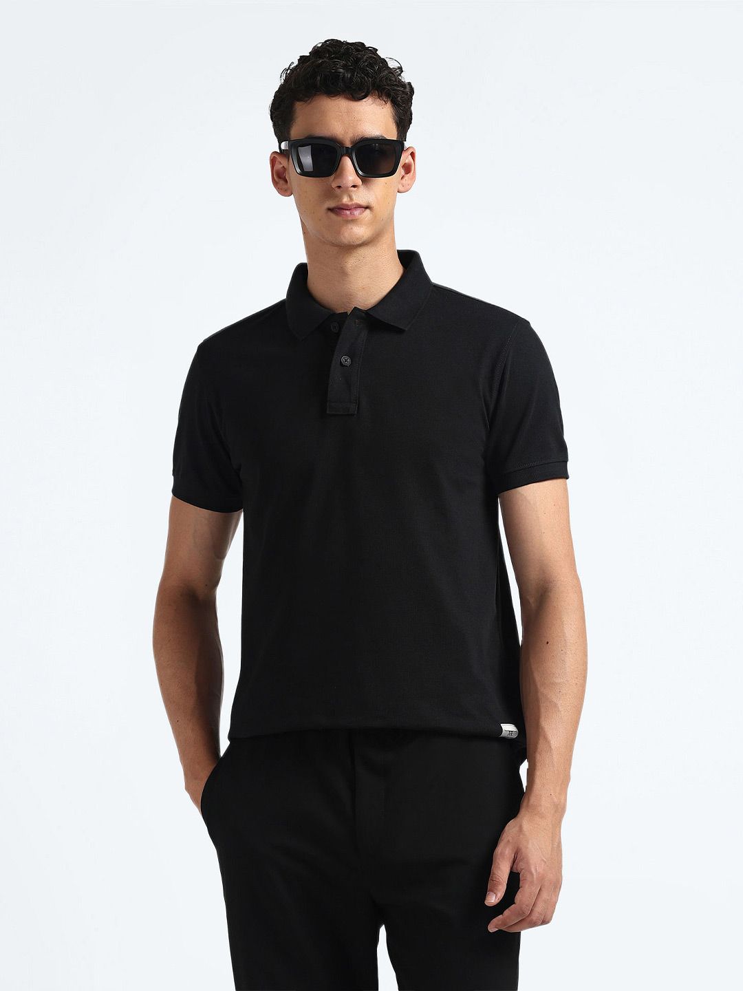Men Black Polo Collar Cotton Slim Fit T-shirt