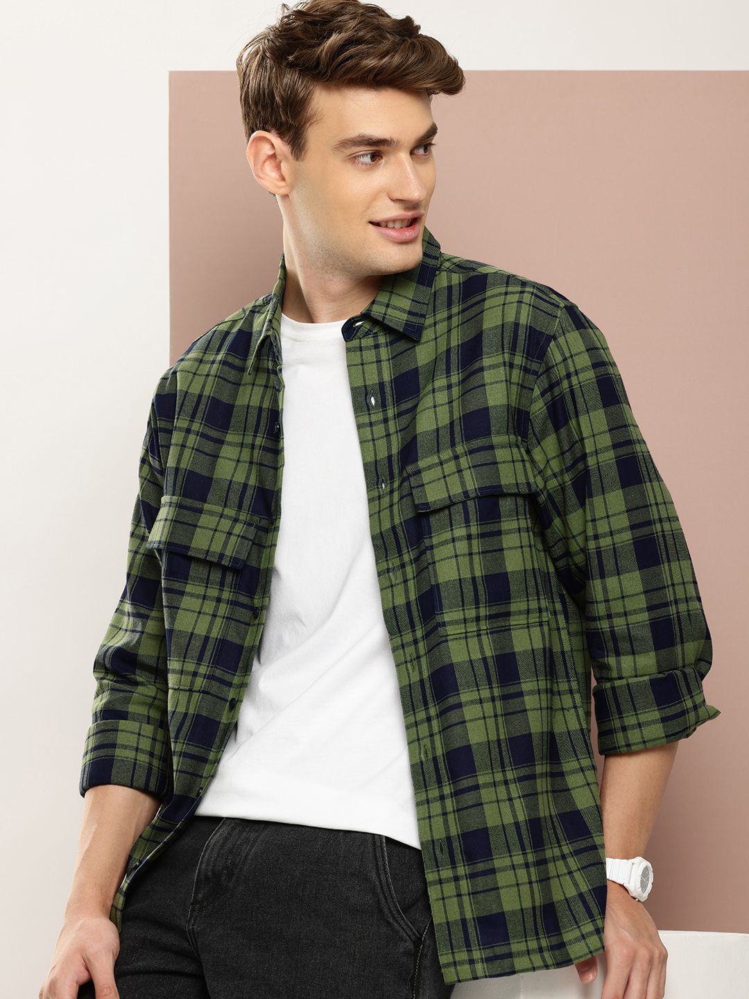Green Classic Checks Spread Collar Long Sleeves Cotton Casual Shirt