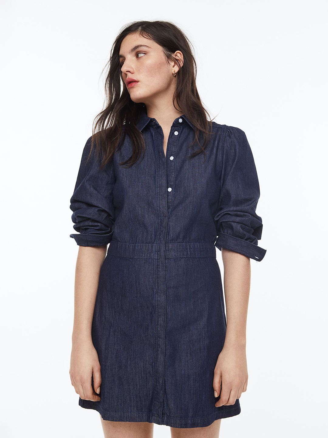 Pure Cotton Puff-Sleeved Denim Shirt Dress