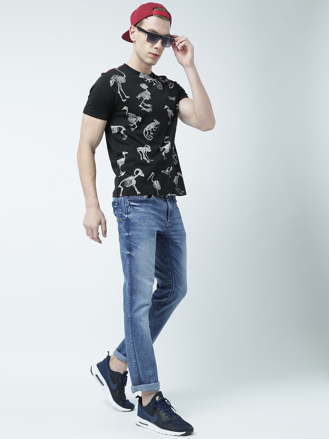 Men Grey Melange & Black Printed Round Neck T-shirt