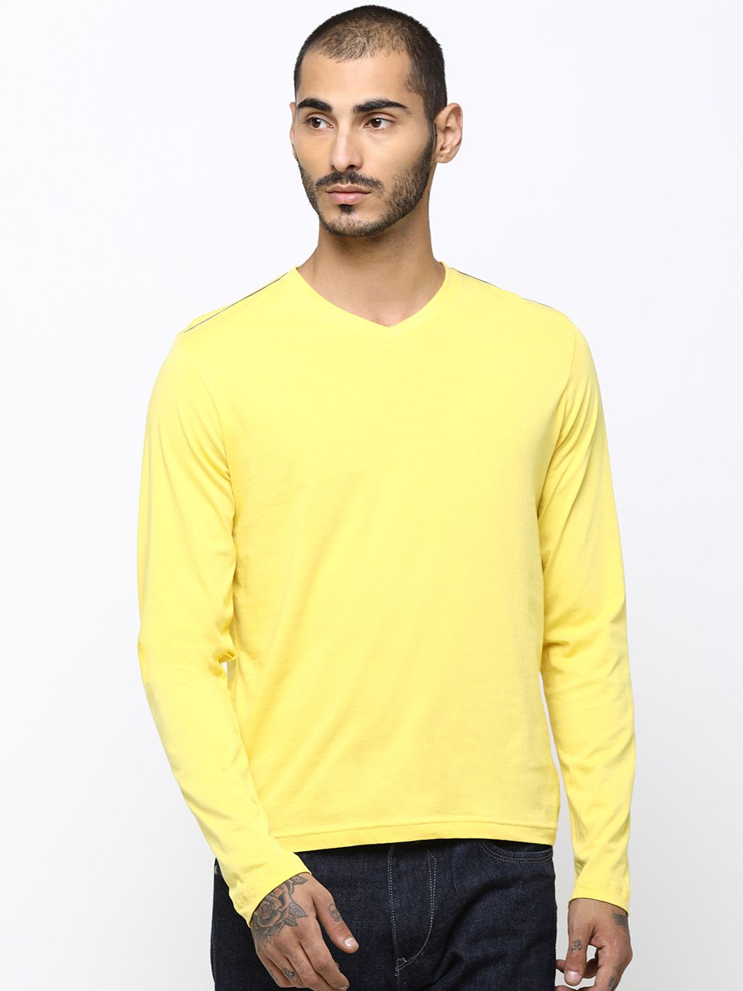 Yellow V-Neck Long Sleeves Regular Fit Cotton T-shirt