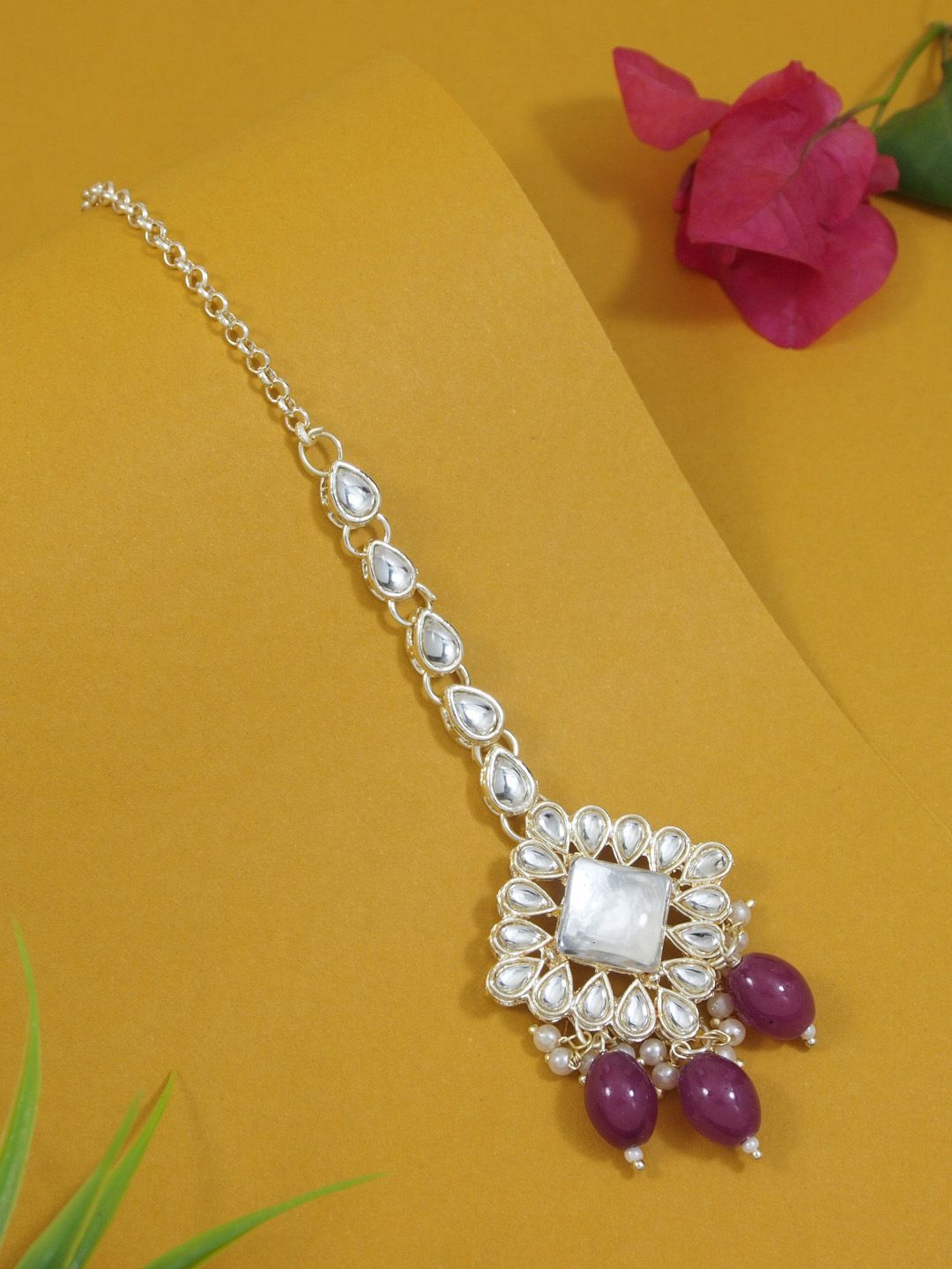 White & Maroon Gold-Plated Kundan Handcrafted Maang Tikka
