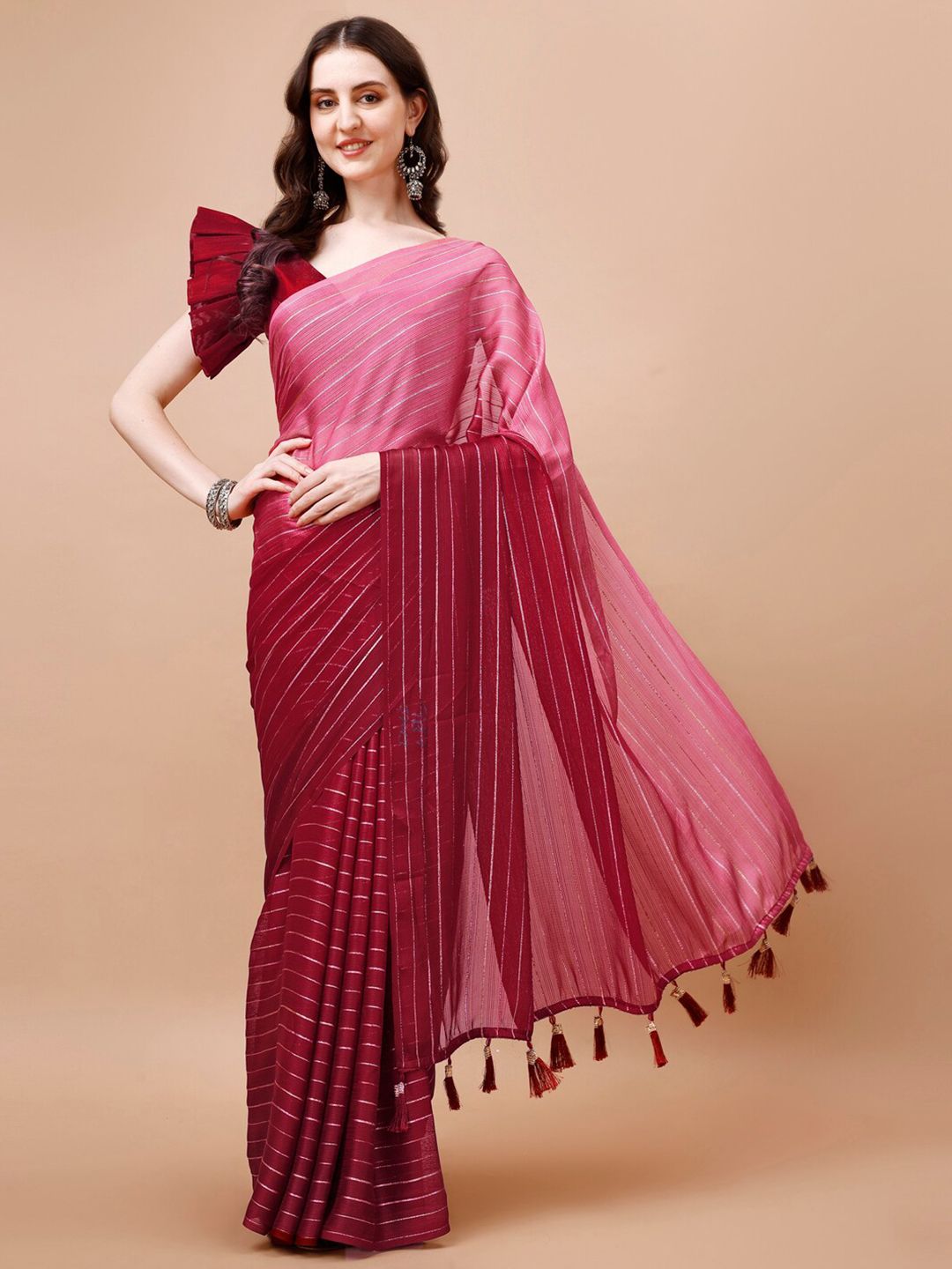 Maroon & Green Striped Stone Work Pure Chiffon Saree