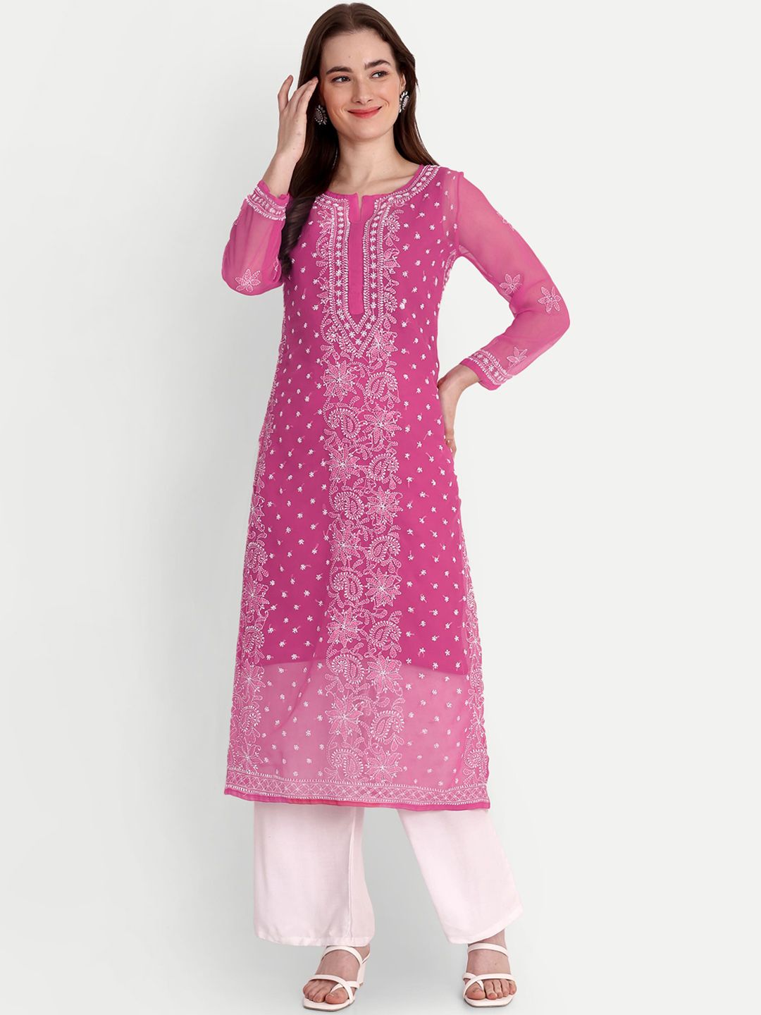 Women Magenta Ethnic Motifs Chikankari Embroidered Georgette Kurta
