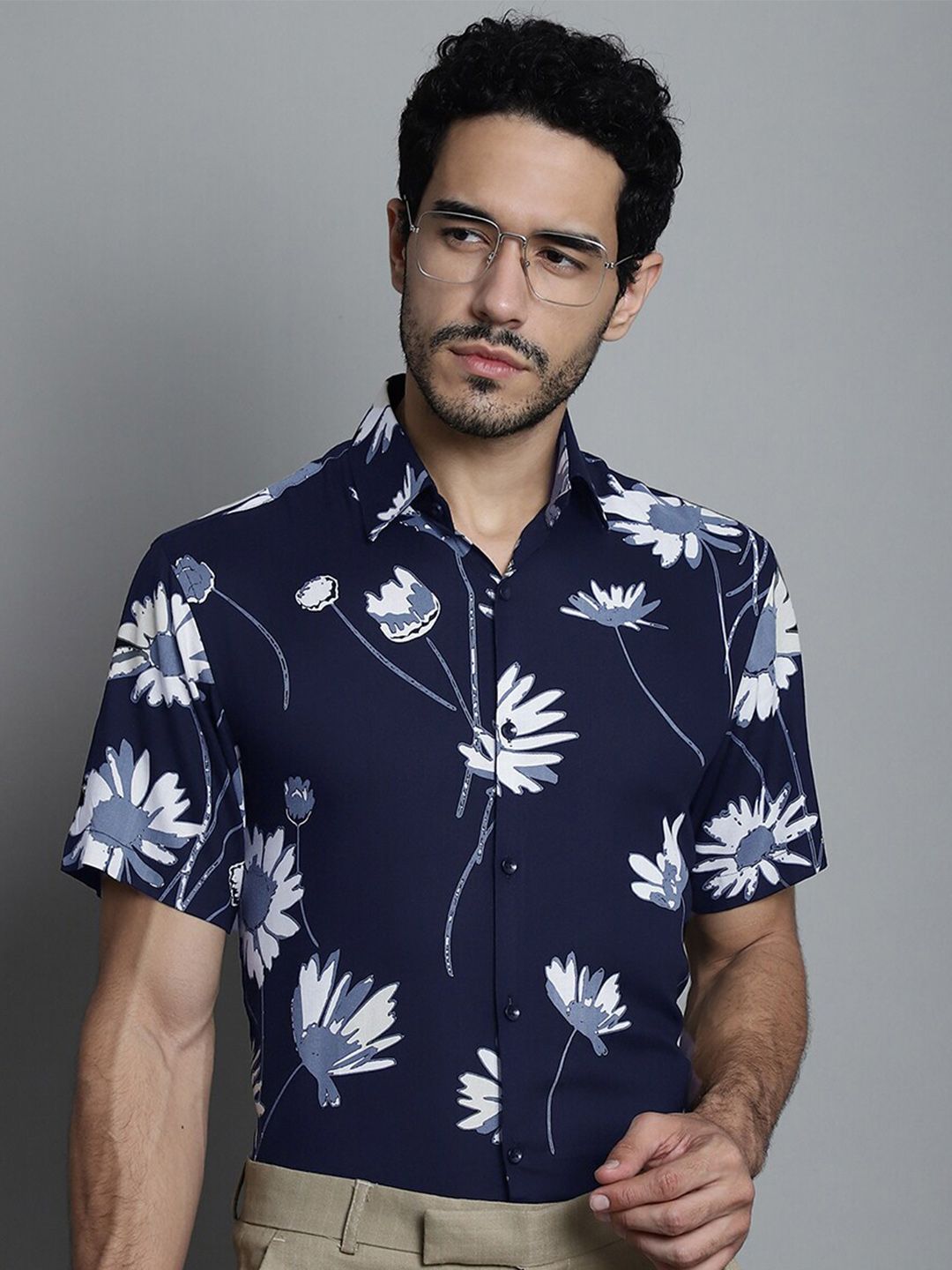 Men Navy Blue Slim Fit Floral Printed Casual Shirt