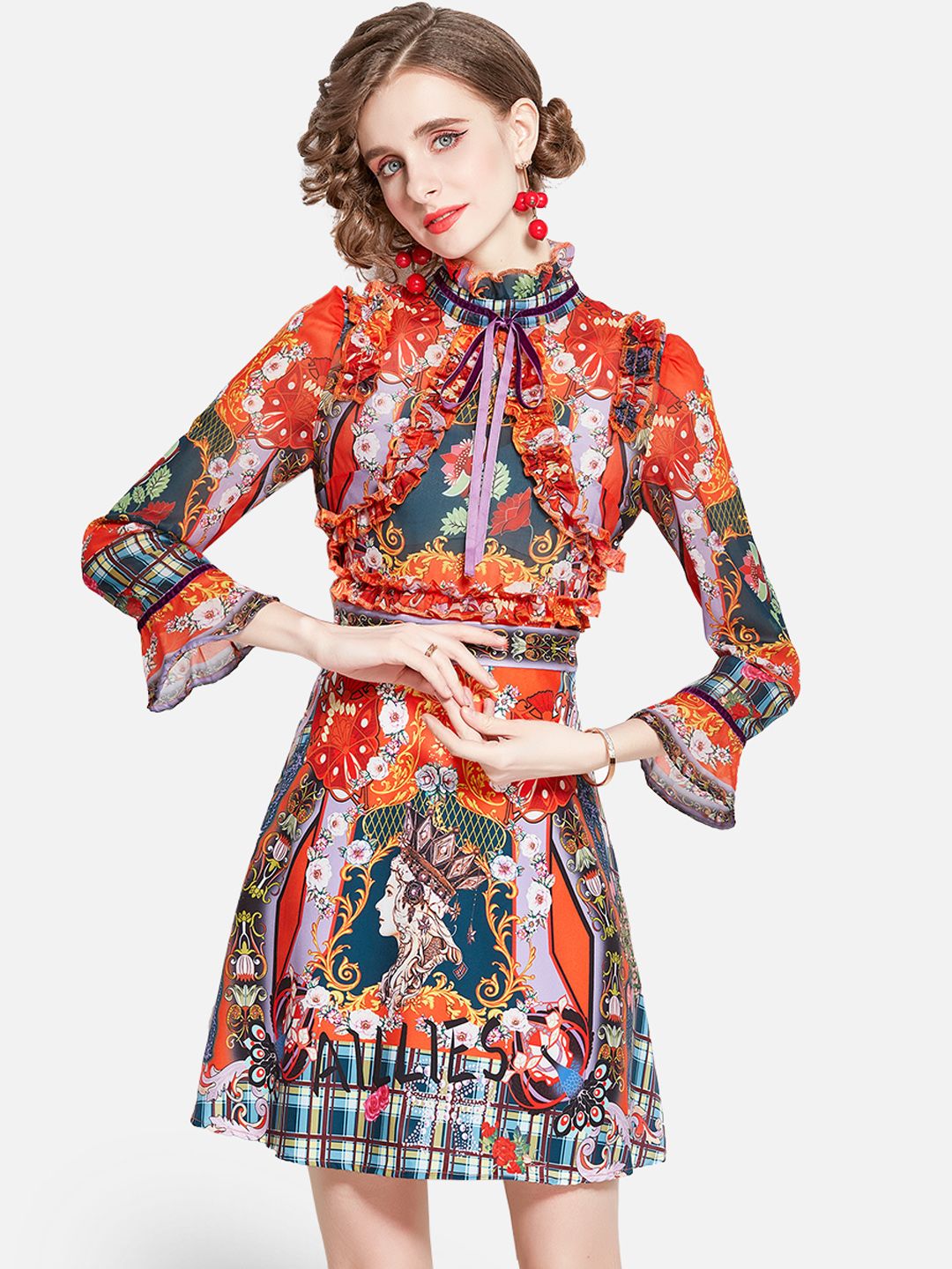 Floral Printed Mandarin Collar Flared Sleeve Fit & Flare Mini Dress