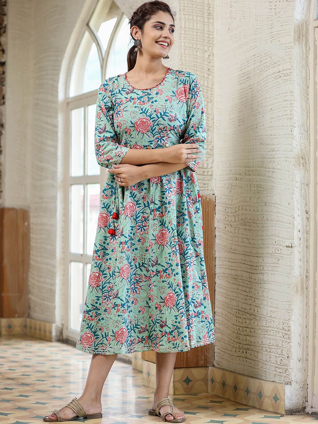 Women Turquoise Blue Printed Cotton Ethnic Dresses
