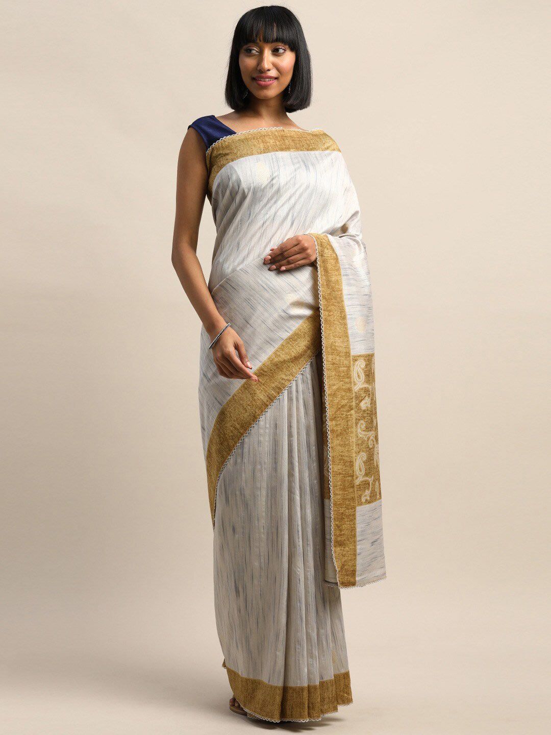 Cream-Coloured & Golden Striped Zari Silk Cotton Solid Saree