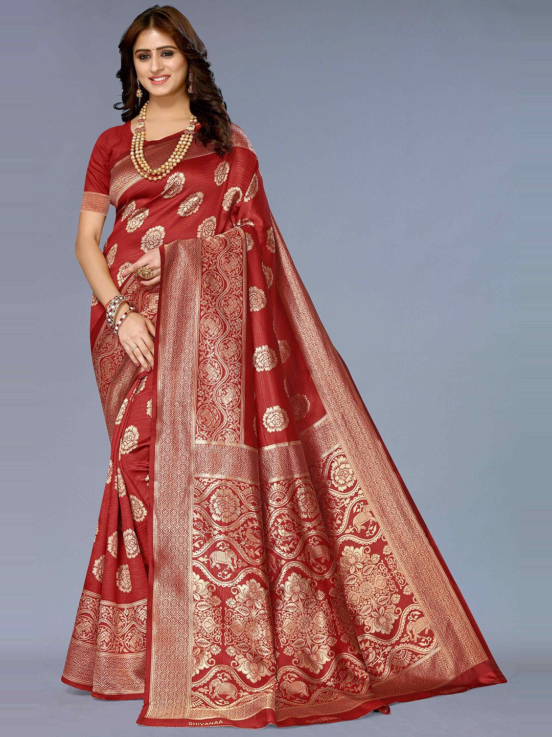 Red & Gold-Toned Ethnic Motifs Zari Silk Blend Banarasi Saree
