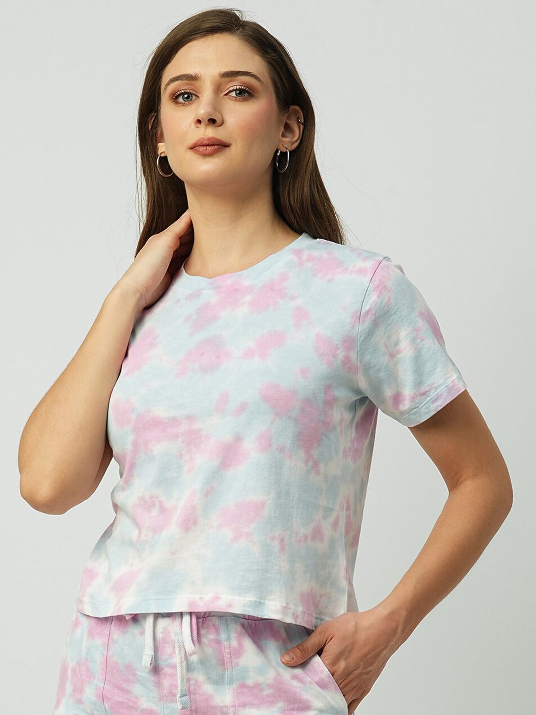 Women Self Design Printed Tie and Dye Round Neck Cotton Slim Fit T-Shirt