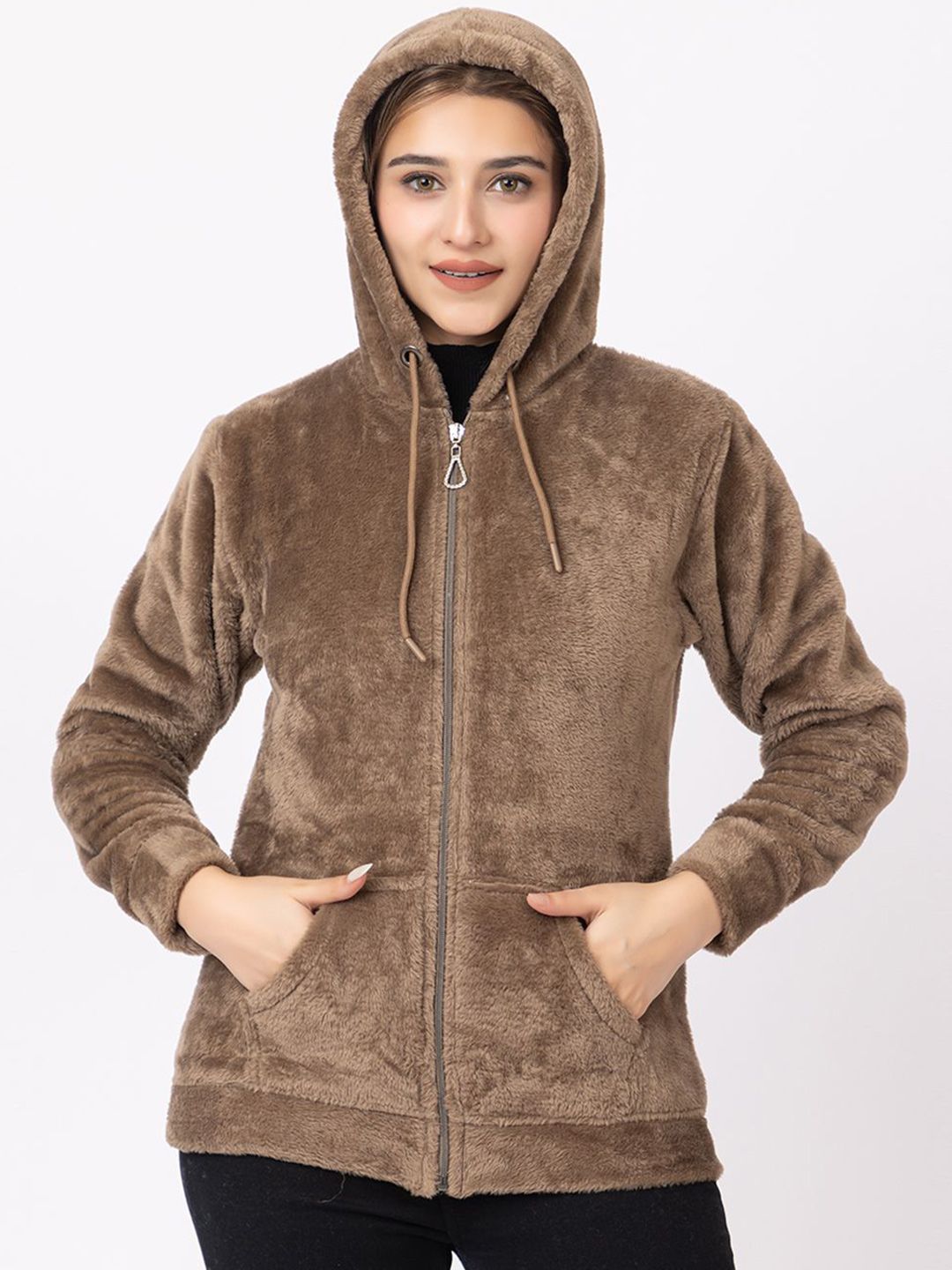Women Brown Solid Fleece Hooded Sweatshirt