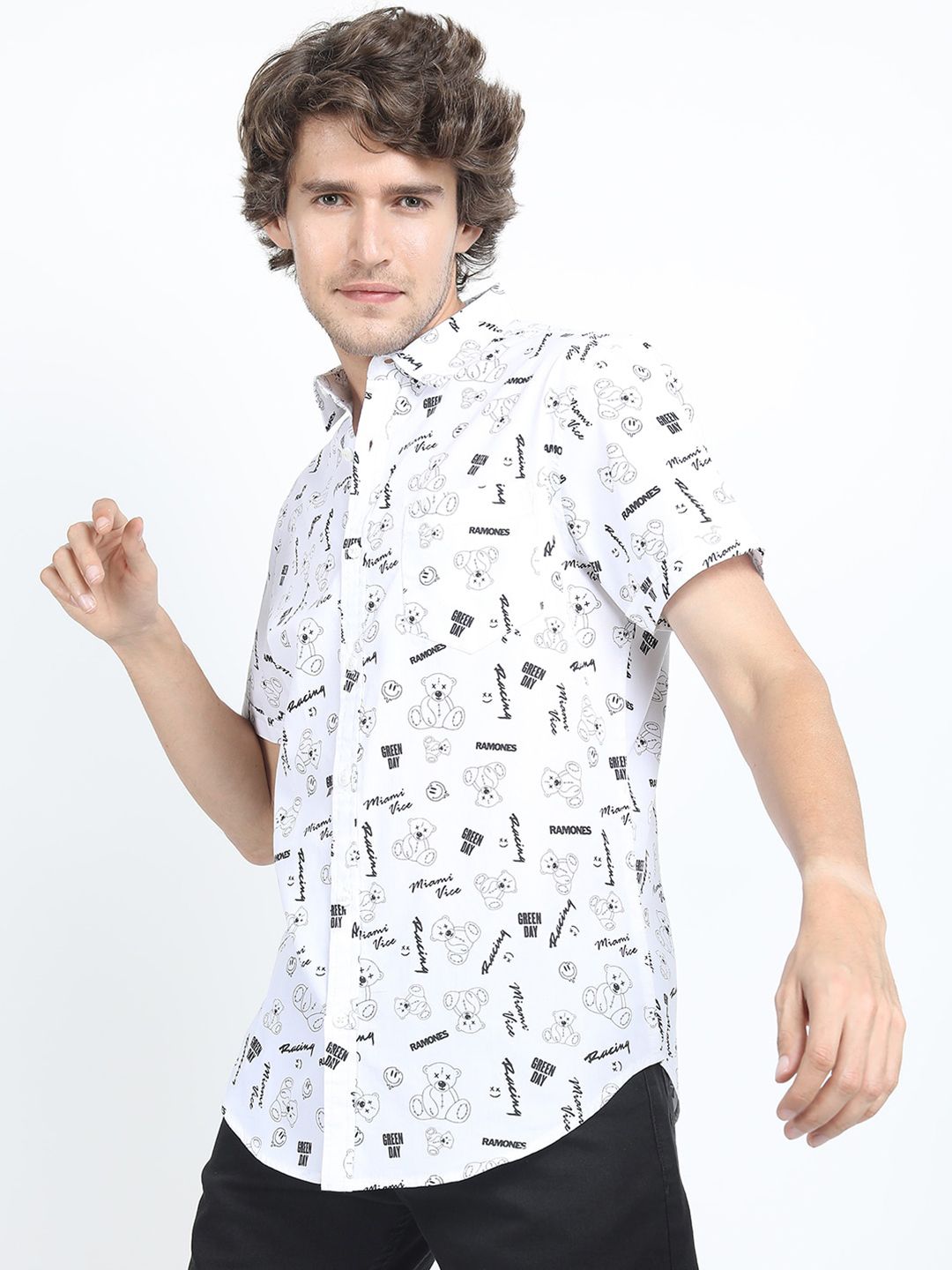 Men White Conversational Printed Slim Fit Casual Cotton Shirt