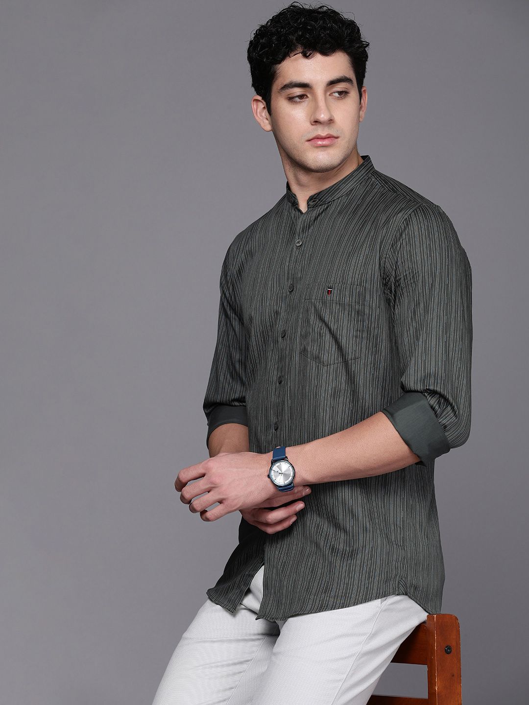 Men Pure Cotton Solid Band Collar Slim Fit Opaque Casual Shirt