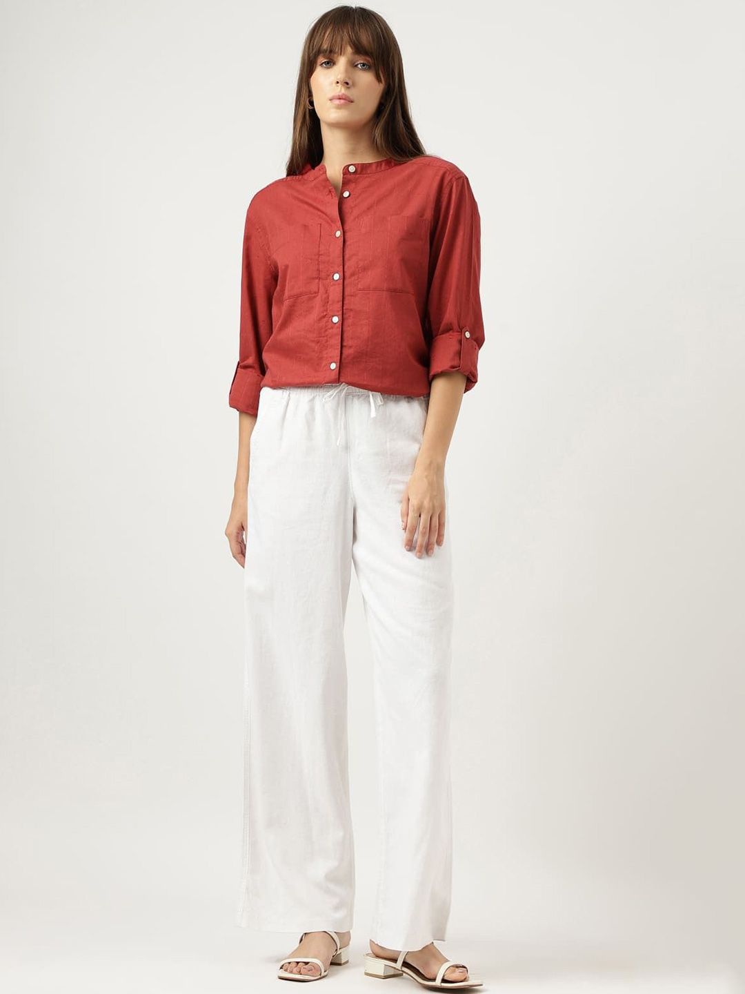 Women Mandarin Collar Solid Cotton Linen Relaxed Fit Casual Shirt
