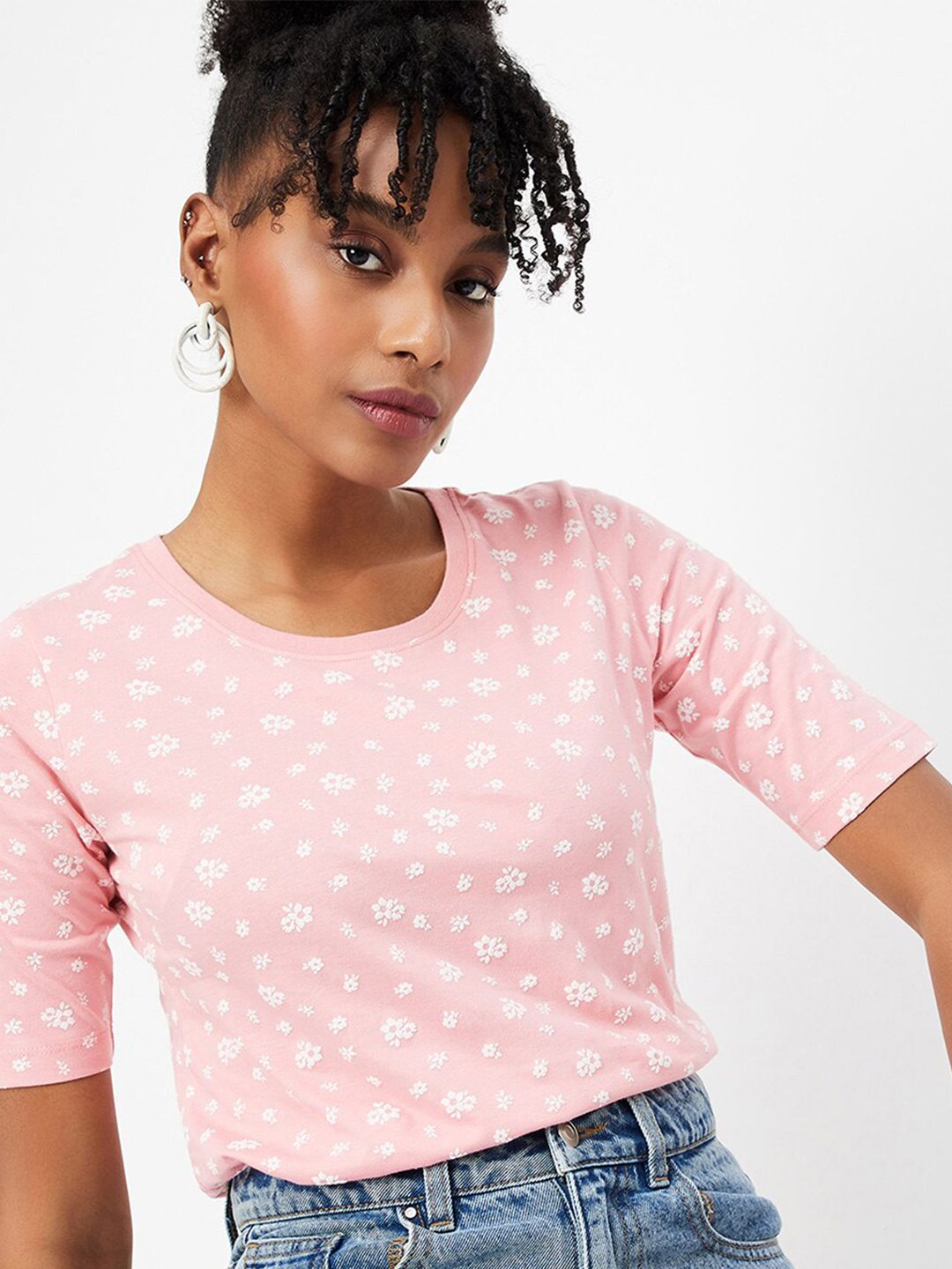 Women Pink Floral Printed Round Neck Cotton T-shirt