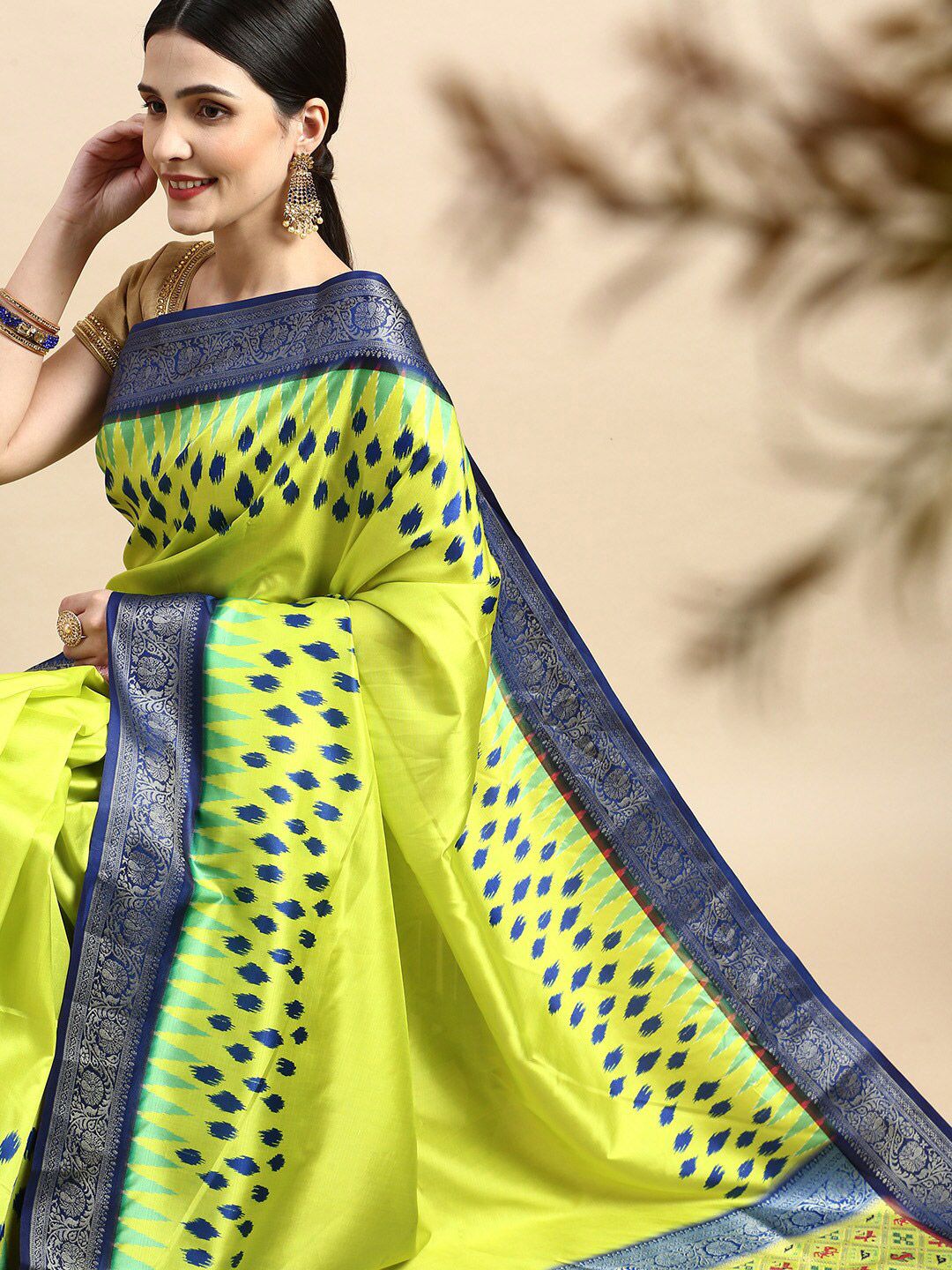Lime Green & Golden Ethnic Motifs Pochampally Saree