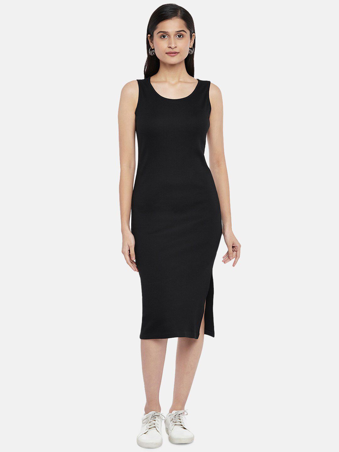Women Black Solid Midi Front-Slit Pure Cotton Bodycon Dress