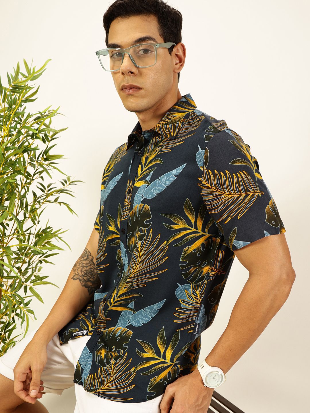 Men Navy Blue Slim Fit Floral Printed Casual Shirt