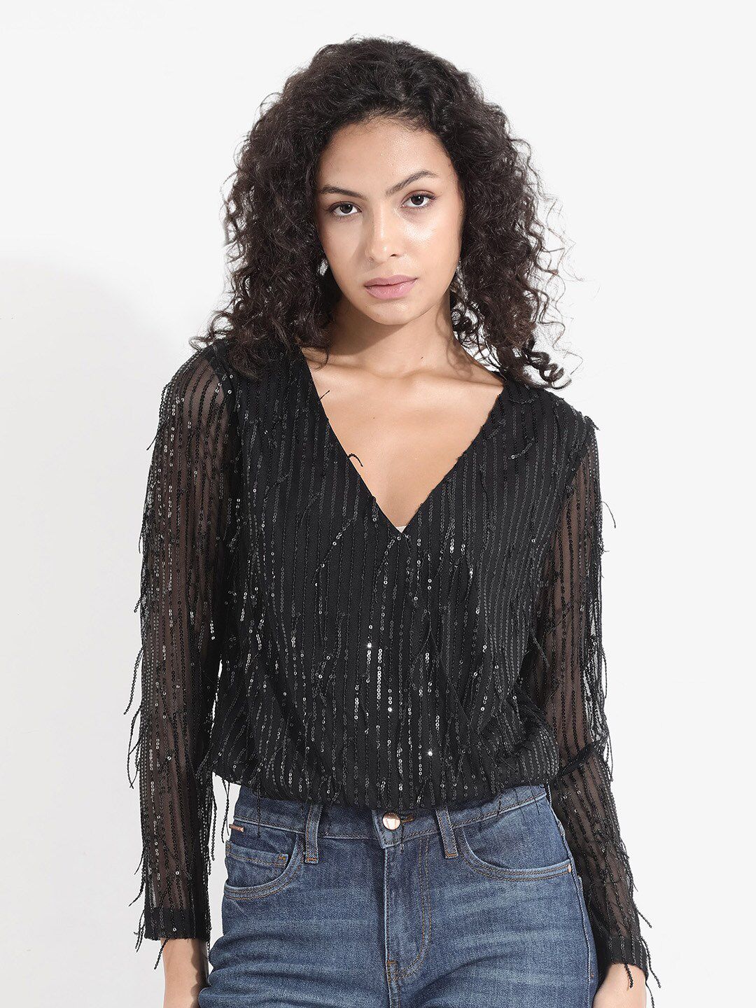 Black Embellished V-Neck Sequinned Wrap Crop Top