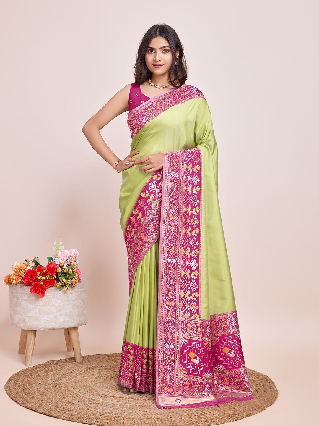 Lime Green & Pink Ethnic Motifs Zari Art Silk Kanjeevaram Saree