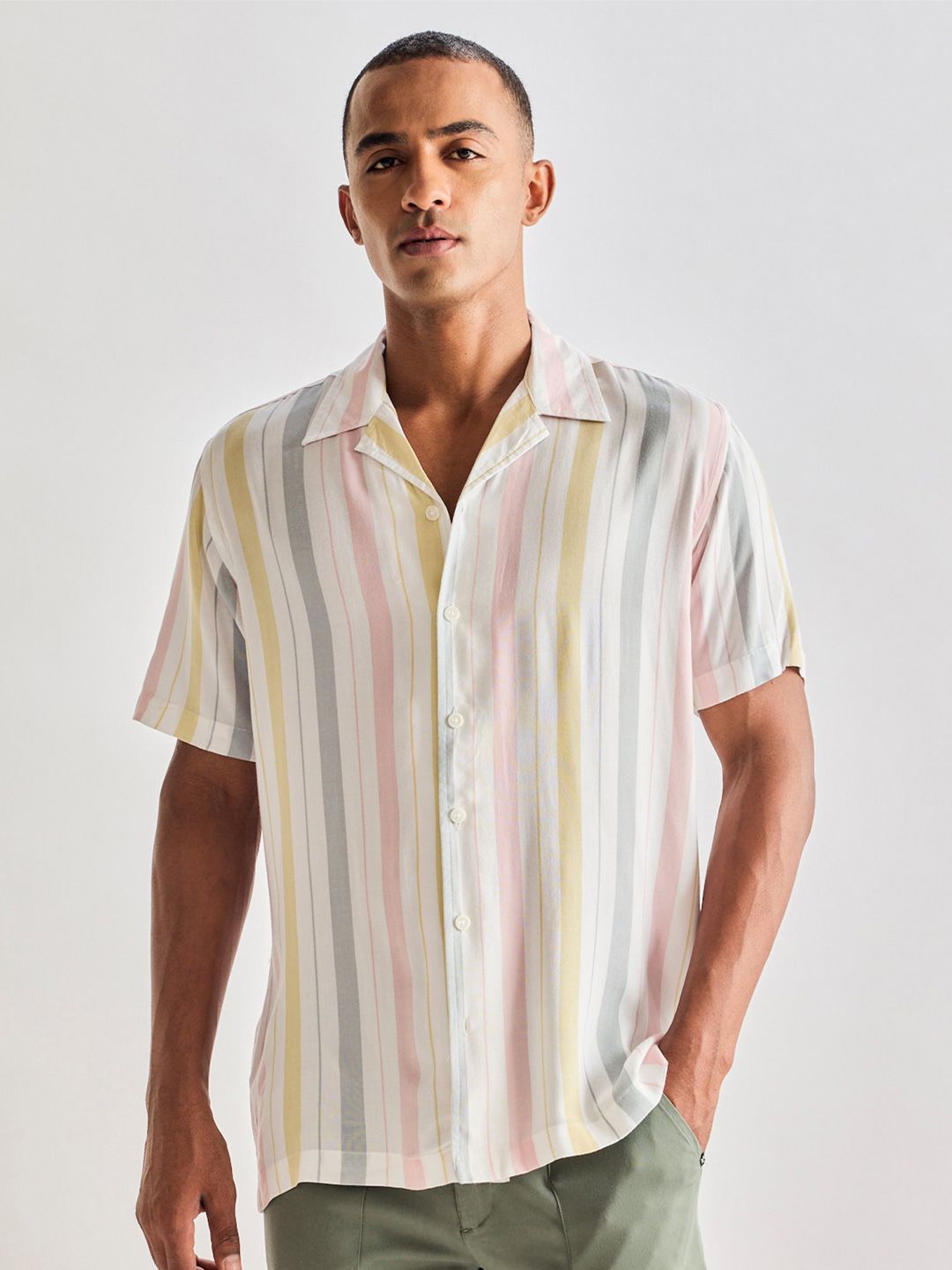 Standard Multi Stripes Cuban Collar Relaxed Fit Cotton Casual Shirt